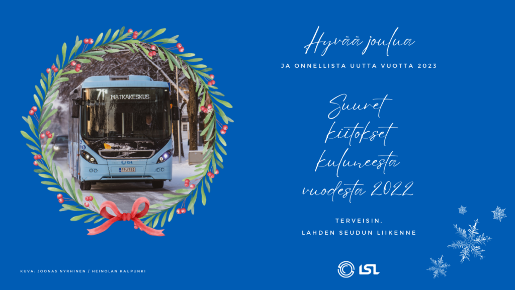 Jouluaattona la 24.12. ajetaan lauantain aikatauluilla. Liikennöinti päättyy klo 13, mutta klo 13 lähtevät vuorot ajetaan vielä loppuun.