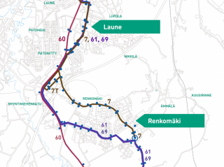 Uudet linjat 61 ja 69 ajavat Renkomäessä uutta Renkomäen väylää pitkin. Alkuperäisestä suunnitelmasta poiketen linjat 61 ja 69 ajetaan 1.1. alkaen Launeella Ajokadun kautta. Muutoksen ansiosta Renkomäen alueen koululaisten kulkeminen Lähteen koululle helpottuu.