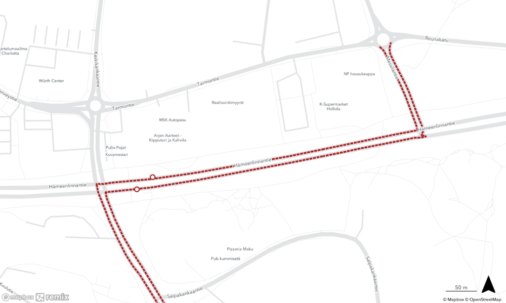 Hollolan Keskikankaantiellä sähköverkon saneeraustyö sulkee Hämeenlinnantien suuntaan menevän liittymän Keskikankaantien ja Tarmontien risteyksessä. Linjat 4H, 4Y ja 21A/B ajetaan molempiin suuntiin Messiläntien ja Hämeenlinnantien kautta. Pullapojat-pysäkit Hämeenlinnantiellä ovat käytössä.